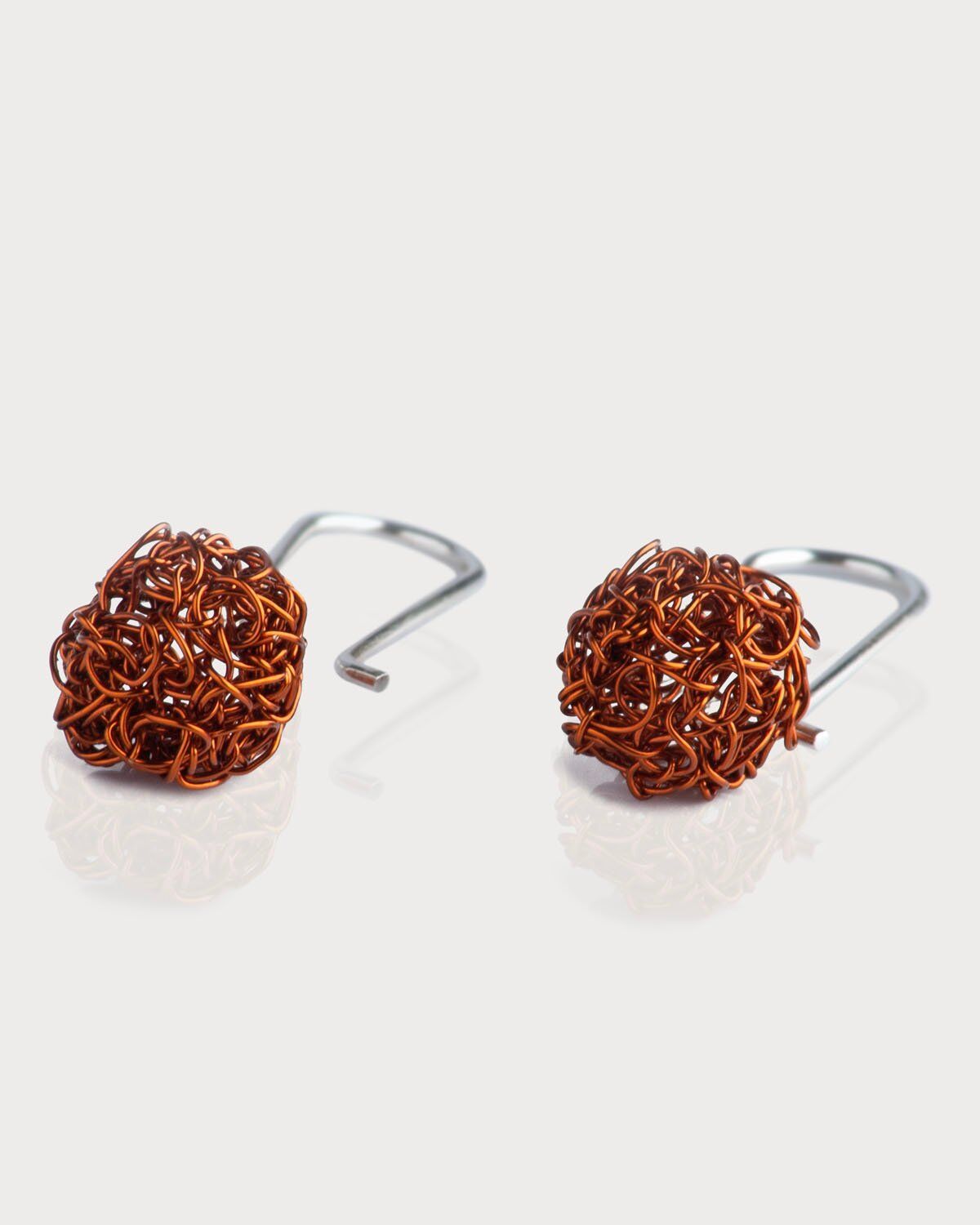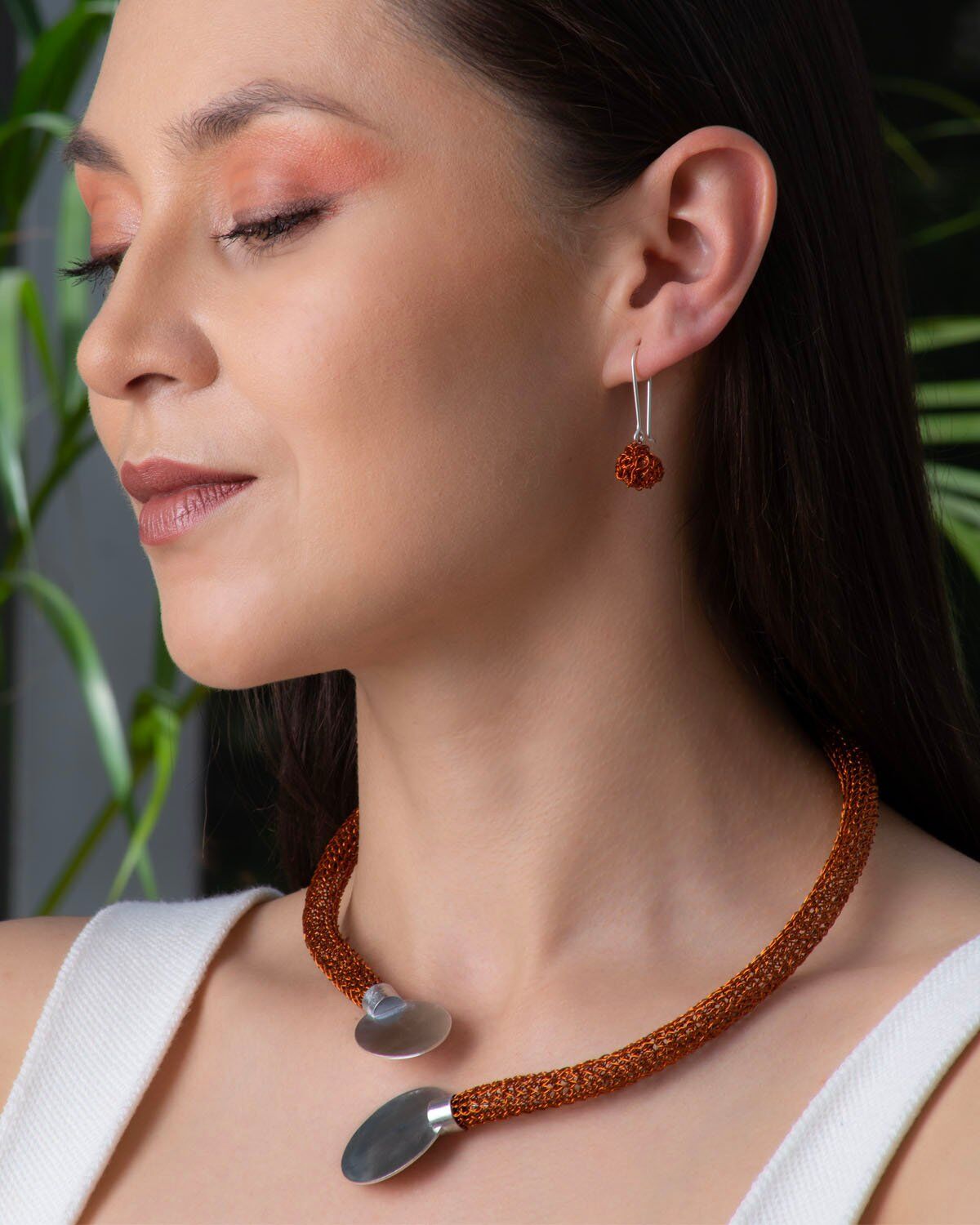 Aretes tipo pescador, con esfera tejida en hilos de cobre con técnica crochet, y colgante de plata ley 925. Esta es una joya de autor hecha a mano, lo cual la convierte en una pieza única y exclusiva.