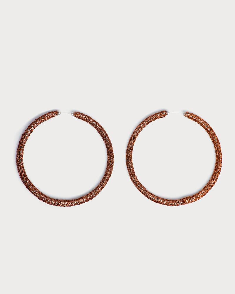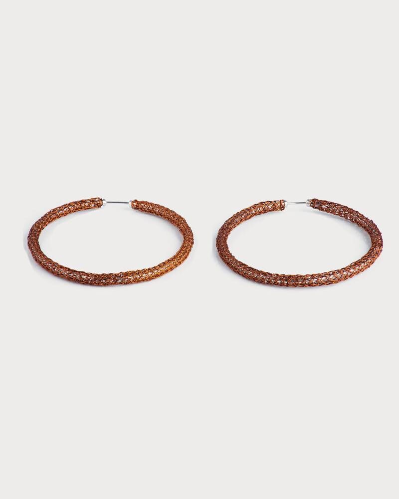 Aretes tipo candonga, tejidos con hilos de cobre en técnica crochet, con alma en aro de plata ley 925. Esta es una joya de autor hecha a mano, lo cual la convierte en una pieza única y exclusiva.