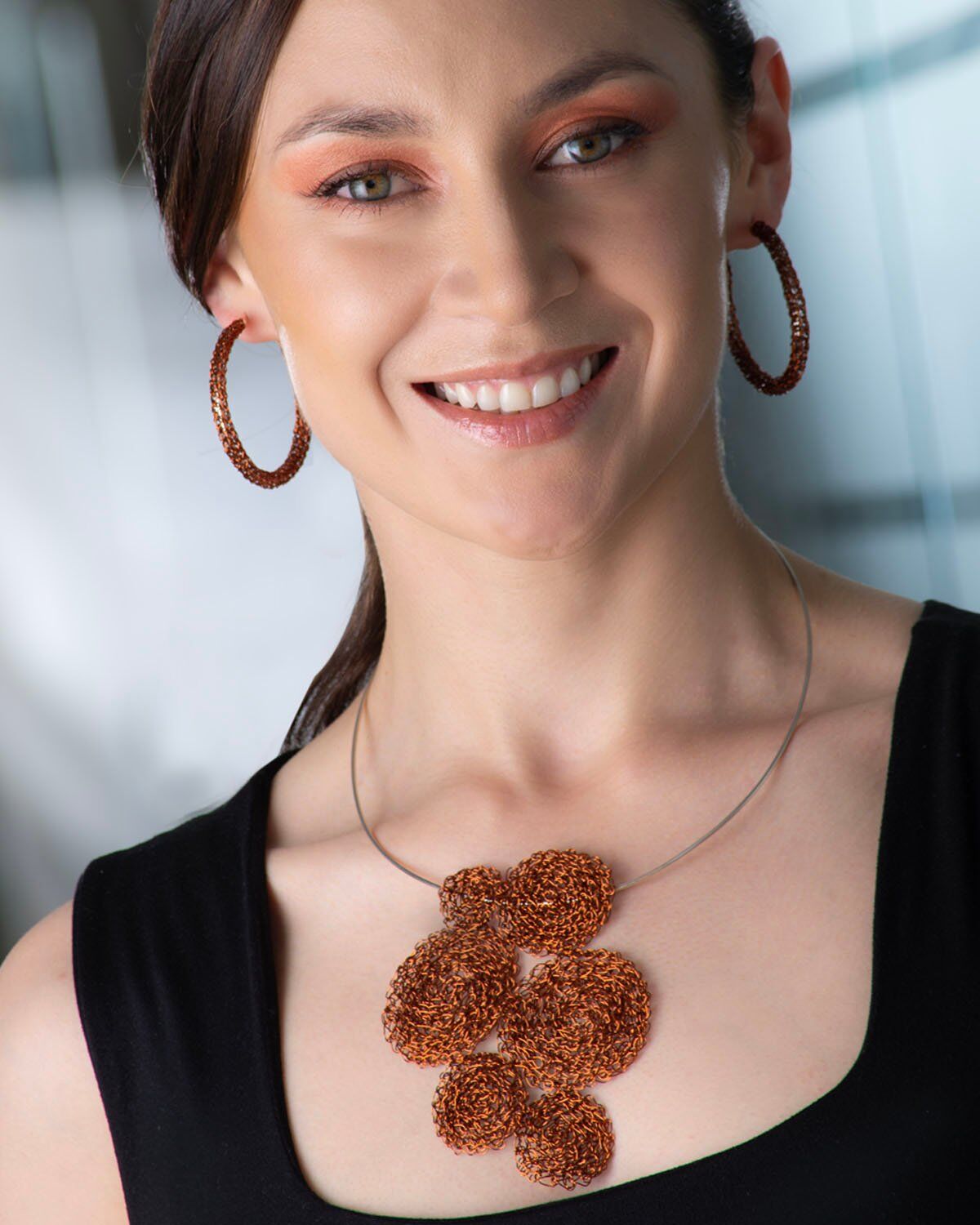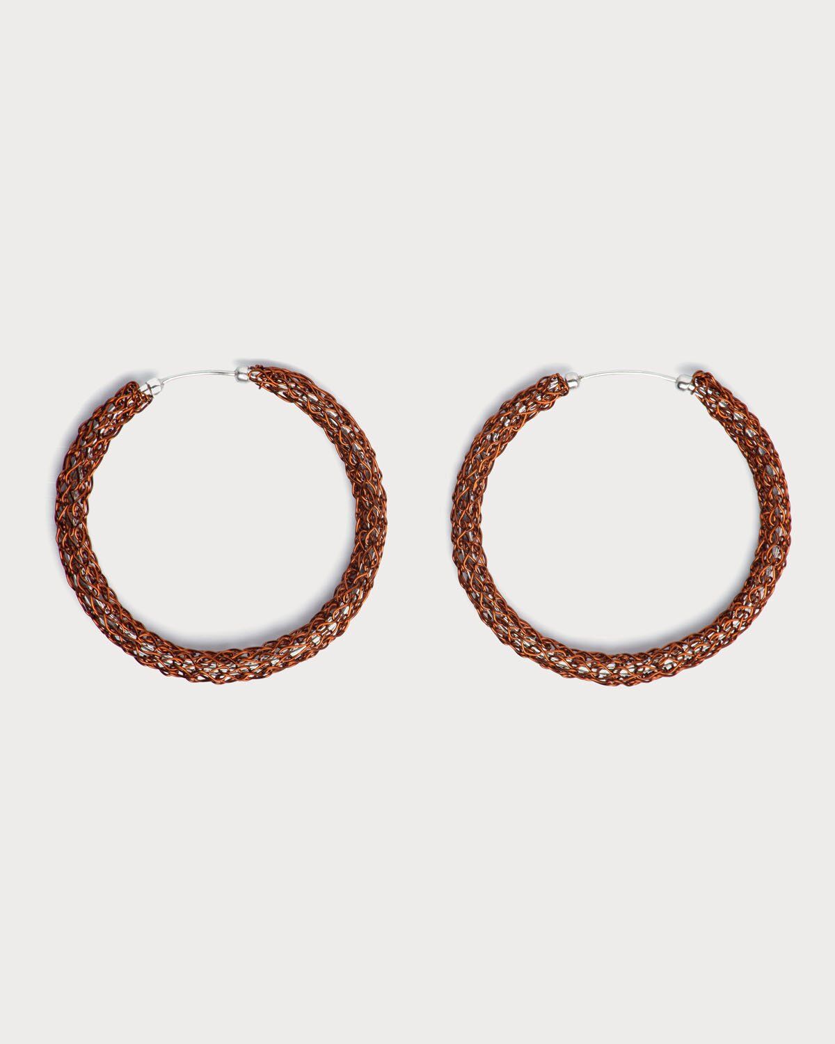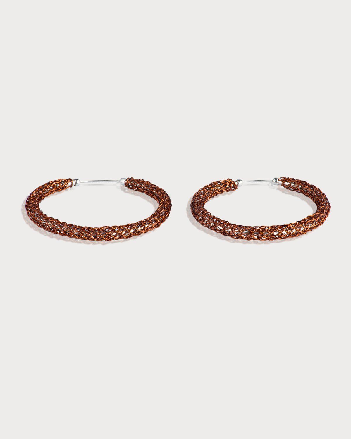 Aretes tipo candonga, tejidos con hilos de cobre en técnica crochet, con alma en aro de plata ley 925. Esta es una joya de autor hecha a mano, lo cual la convierte en una pieza única y exclusiva.