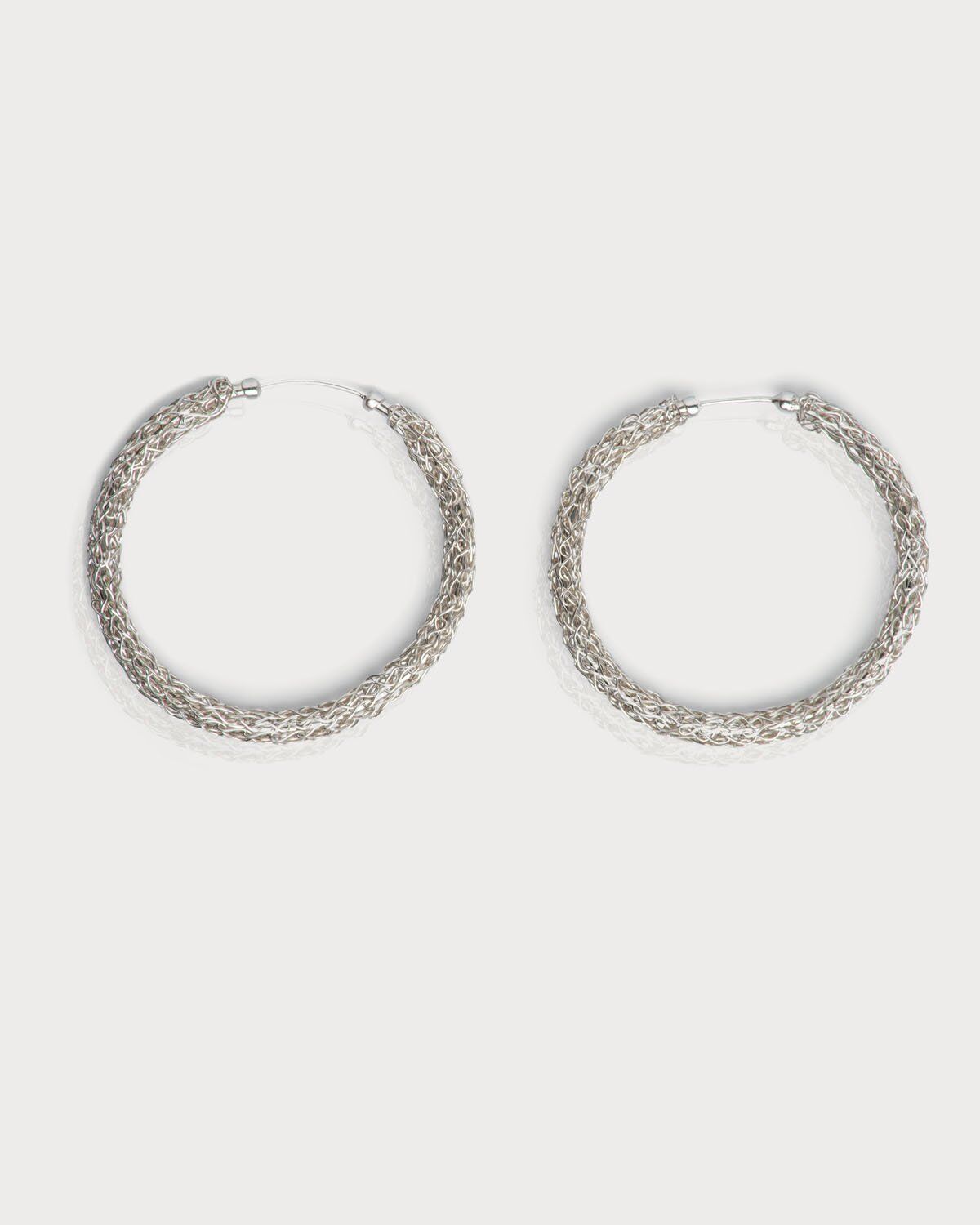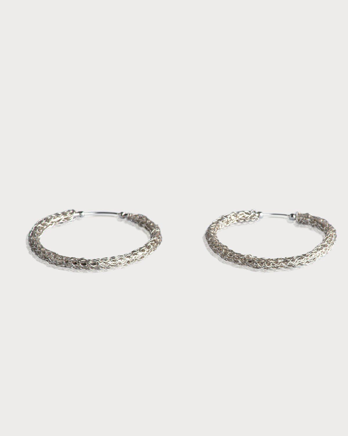Aretes tipo candonga, tejidos con hilos de plata en técnica crochet, con alma en aro de plata ley 925. Esta es una joya de autor hecha a mano, lo cual la convierte en una pieza única y exclusiva.