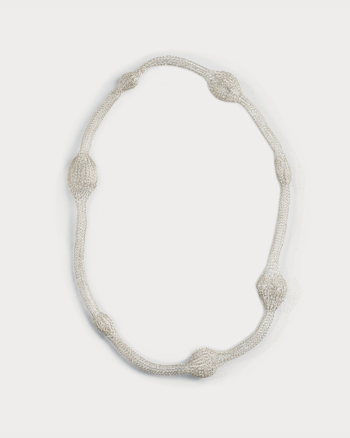 Esta pieza es un collar tubular con esferas, armado a partir de hilos de plata tejidos en técnica crochet. Esta pieza es una joya de autor creada por la diseñadora, hecha a mano, lo cual le imprime una diferenciación a cada joya, volviéndola exclusiva.