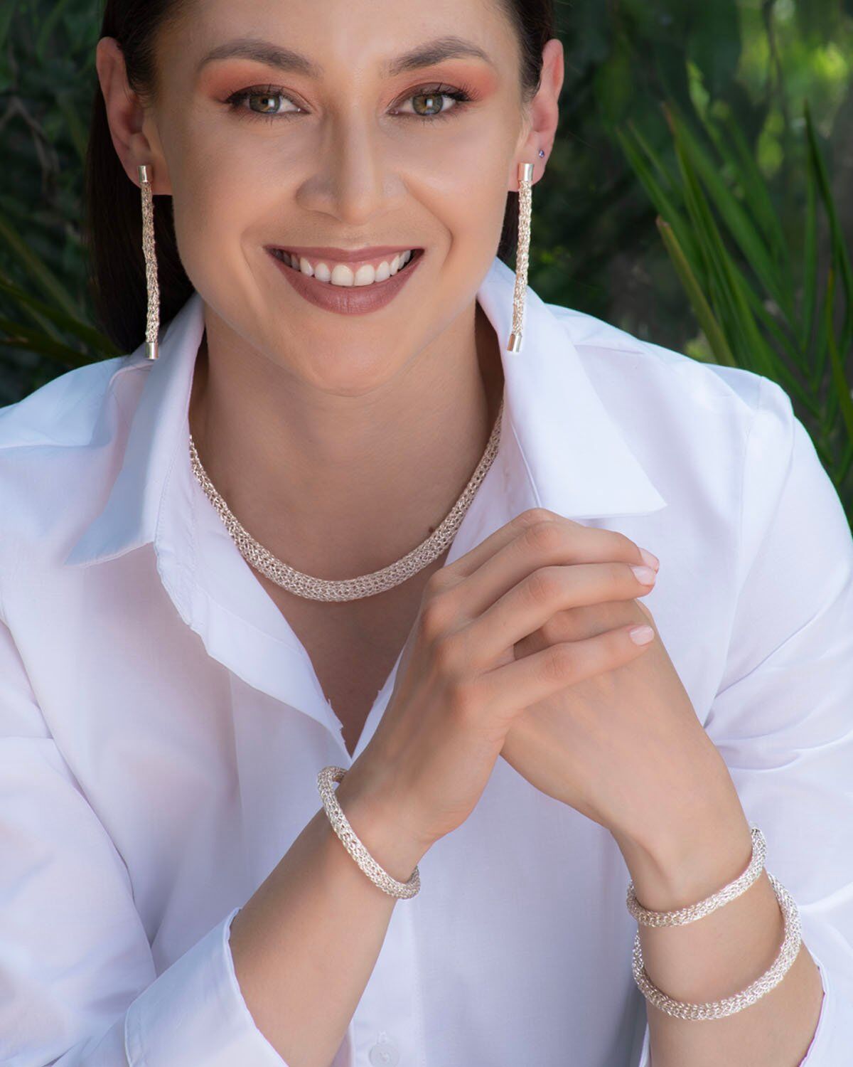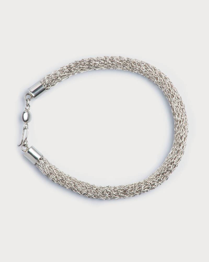 Esta pieza es una pulsera tubular, armada a partir de hilos de plata pura, tejida en técnica crochet con terminales en lamina de plata ley 925. Esta pieza es una joya de autor creada por la diseñadora, hecha a mano, lo cual le imprime una diferenciación a cada joya, volviéndola exclusiva.